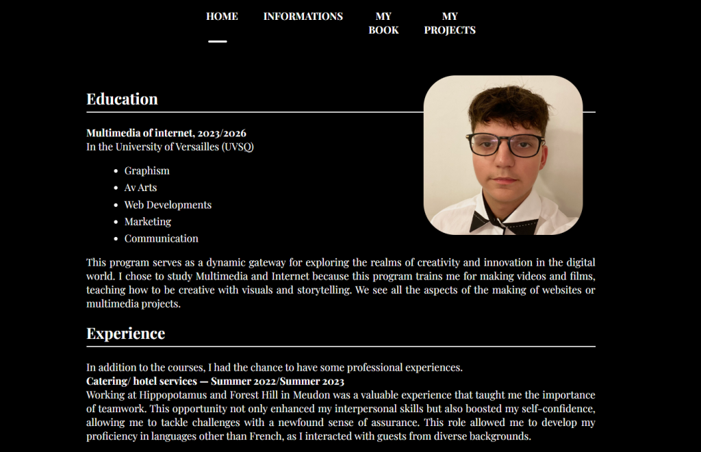 Grâce à mon parcours en BUT MMI, j’ai appris le langage HTML, CSS, Javascript. La maitrise de ces langages m’a permis de construire des sites interactifs et créatifs.